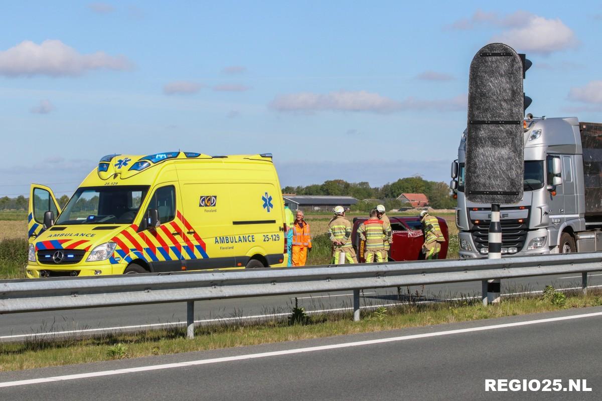 Een Renault Clio kwam rond 09:15 uur door nog onbekende oorzaak op z’n kant naast de weg terecht. De bestuurder raakte hierbij gewond. Onduidelijk is nog of het om een éénzijdig ongeval ging of dat een vrachtwagen erbij betrokken was.