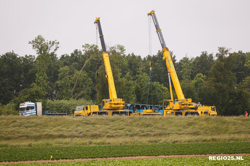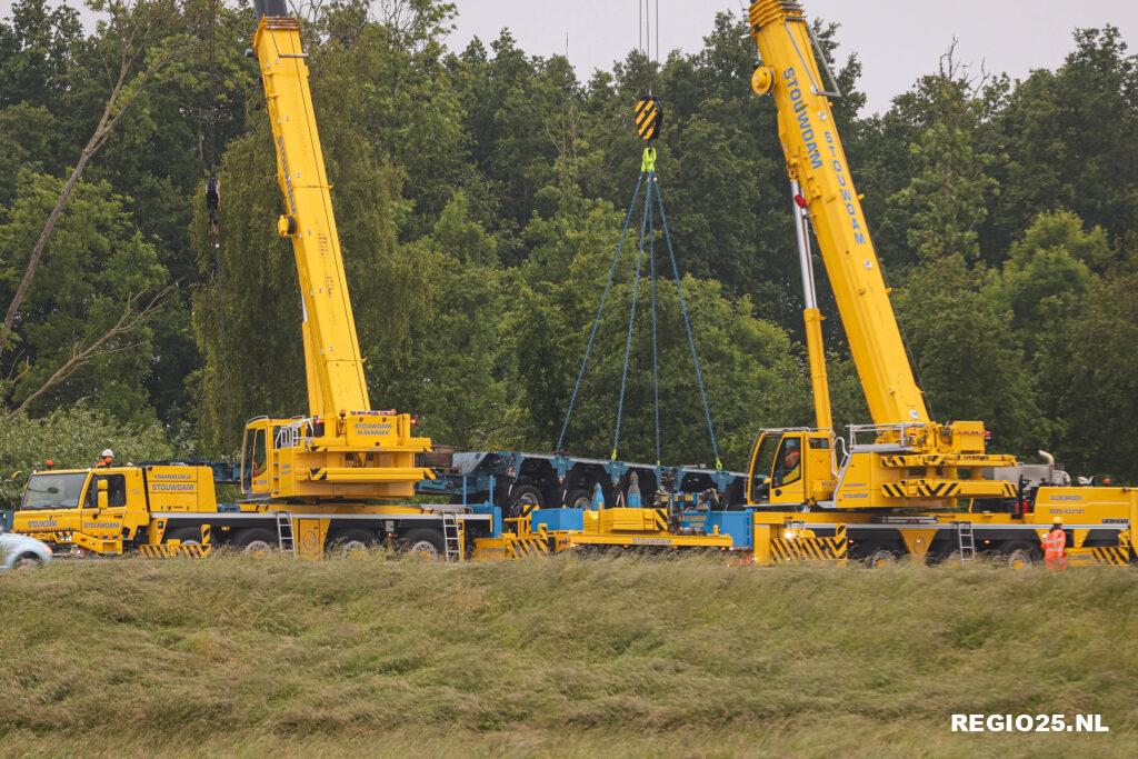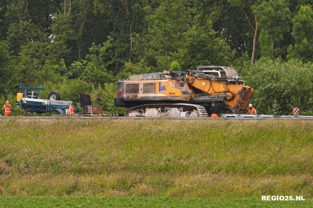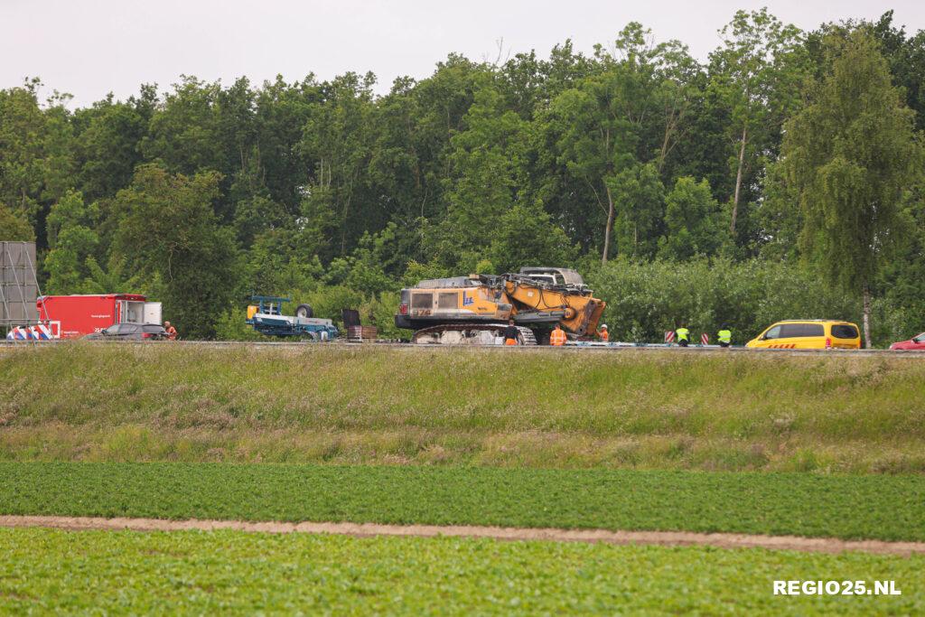 Het bergen van het zware transport heeft enkele uren geduurd. Met behulp van twee kranen en meerdere vrachtwagens konden de beschadigde dieplader en graafmachine worden afgevoerd. Dit was in de loop van de avond afgerond. Hierna is de snelweg schoongemaakt.