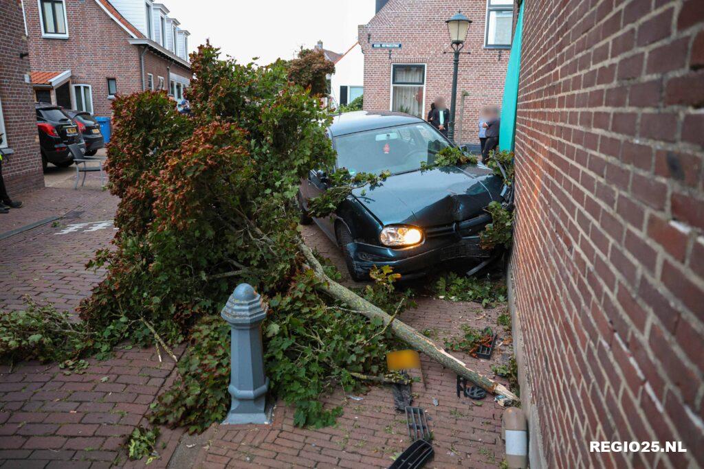 Het ongeluk gebeurde rond 20:45 uur in Wijk 3, ook wel de Schoolstraat genoemd. Een auto raakte een geparkeerde auto, een bloembak en een regenpijp en reed vervolgens aan de andere kant van de straat een boompje doormidden, waarna het voertuig tegen de zijgevel van een woning tot stilstand kwam.
