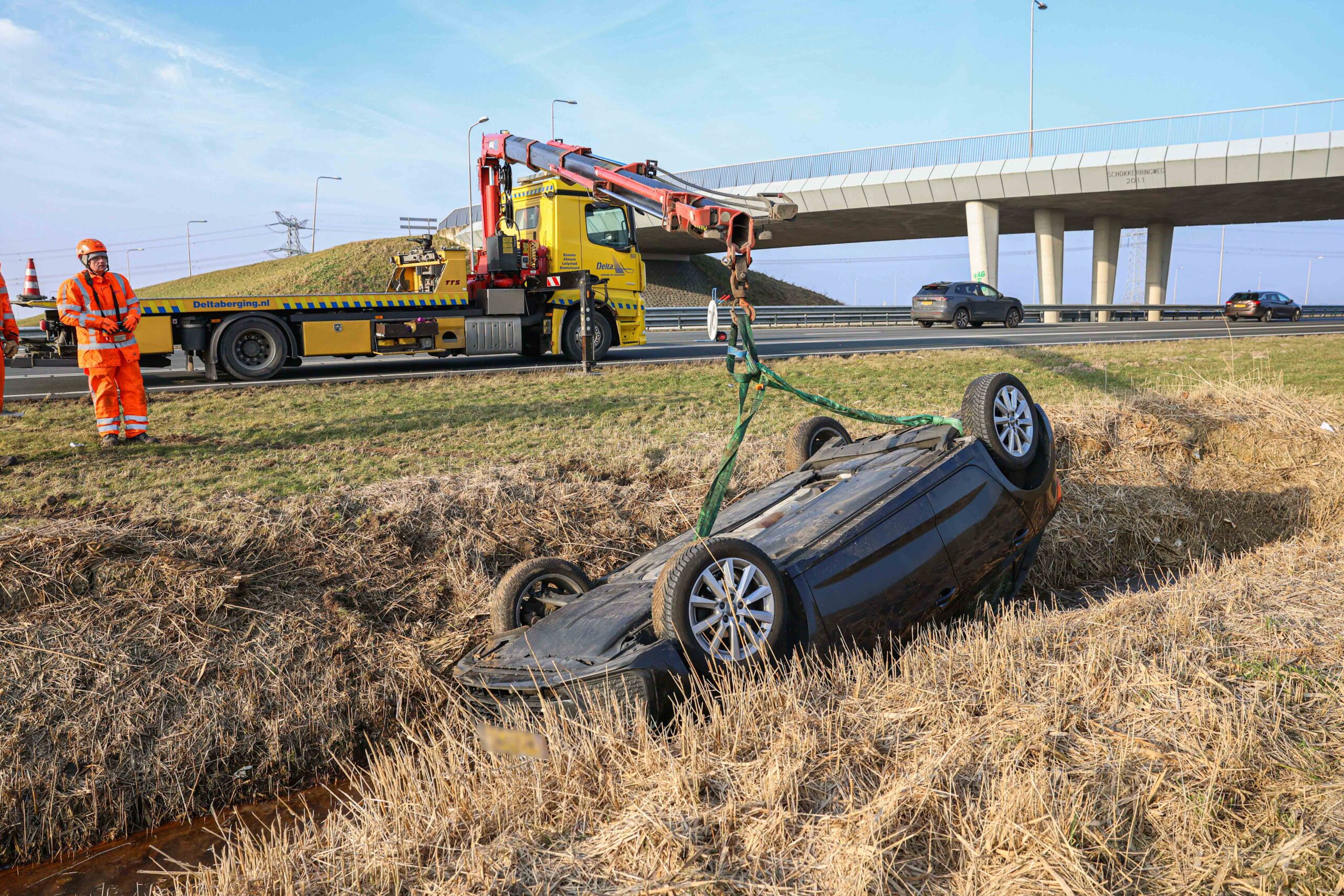 Een auto is dinsdagochtend op de kop in een sloot belandt naast de N50 bij Ens. Het ongeluk gebeurde even voor 09:30 uur ter hoogte van de afrit naar de Schokkerringweg.