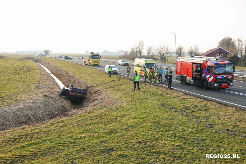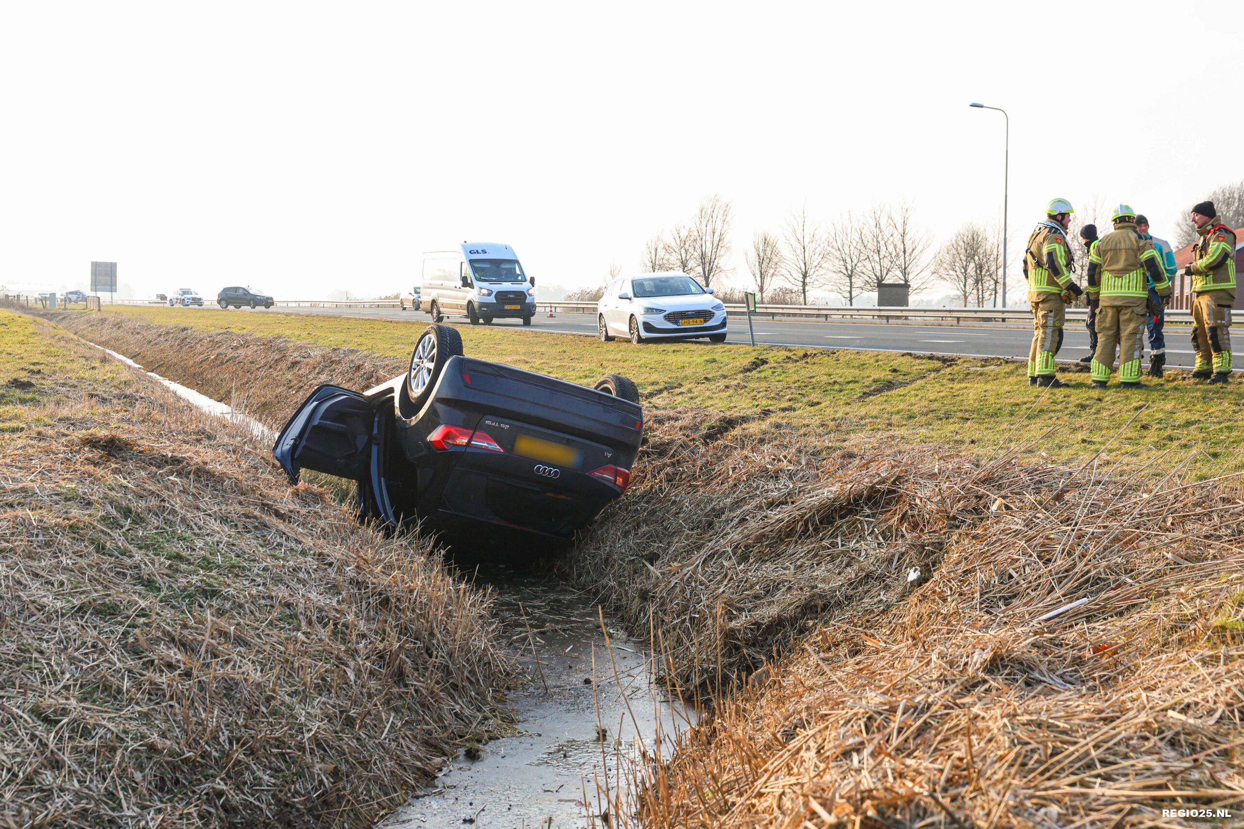 Een auto is dinsdagochtend op de kop in een sloot belandt naast de N50 bij Ens. Het ongeluk gebeurde even voor 09:30 uur ter hoogte van de afrit naar de Schokkerringweg.