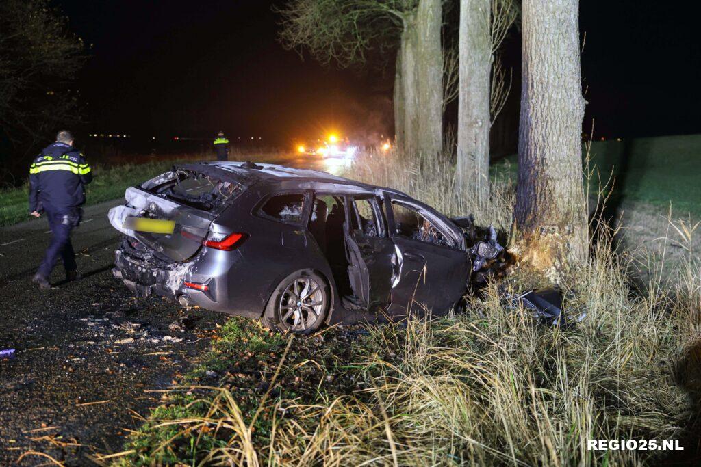 Op de Ramsweg in het buitengebied van Ens is vrijdagavond rond 18:15 uur een auto frontaal tegen een boom gebotst en in brand gevlogen. De twee inzittenden, een man en een jongetje, konden op tijd uit de auto komen.