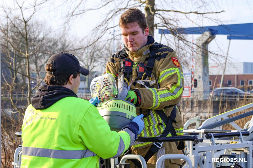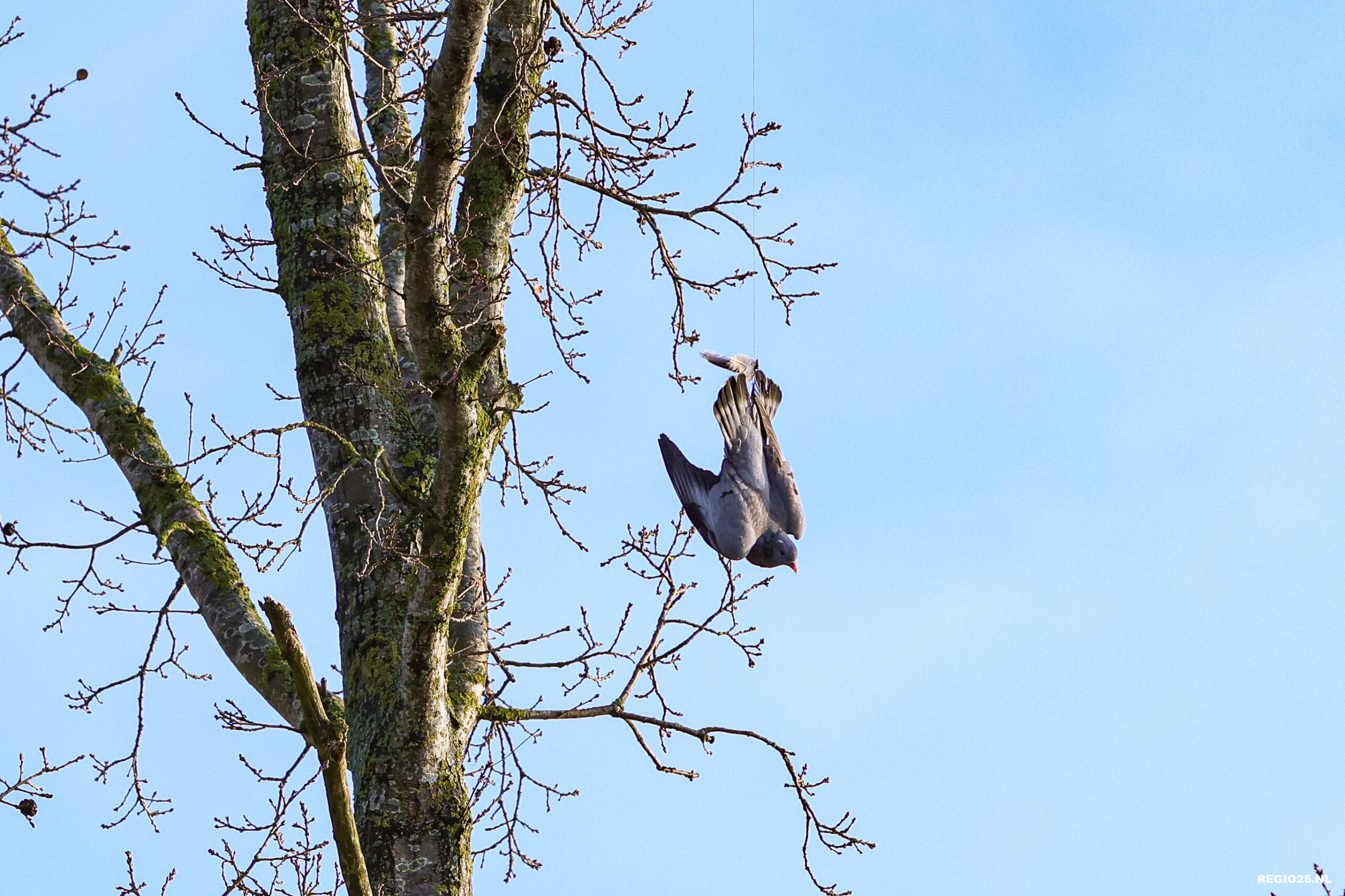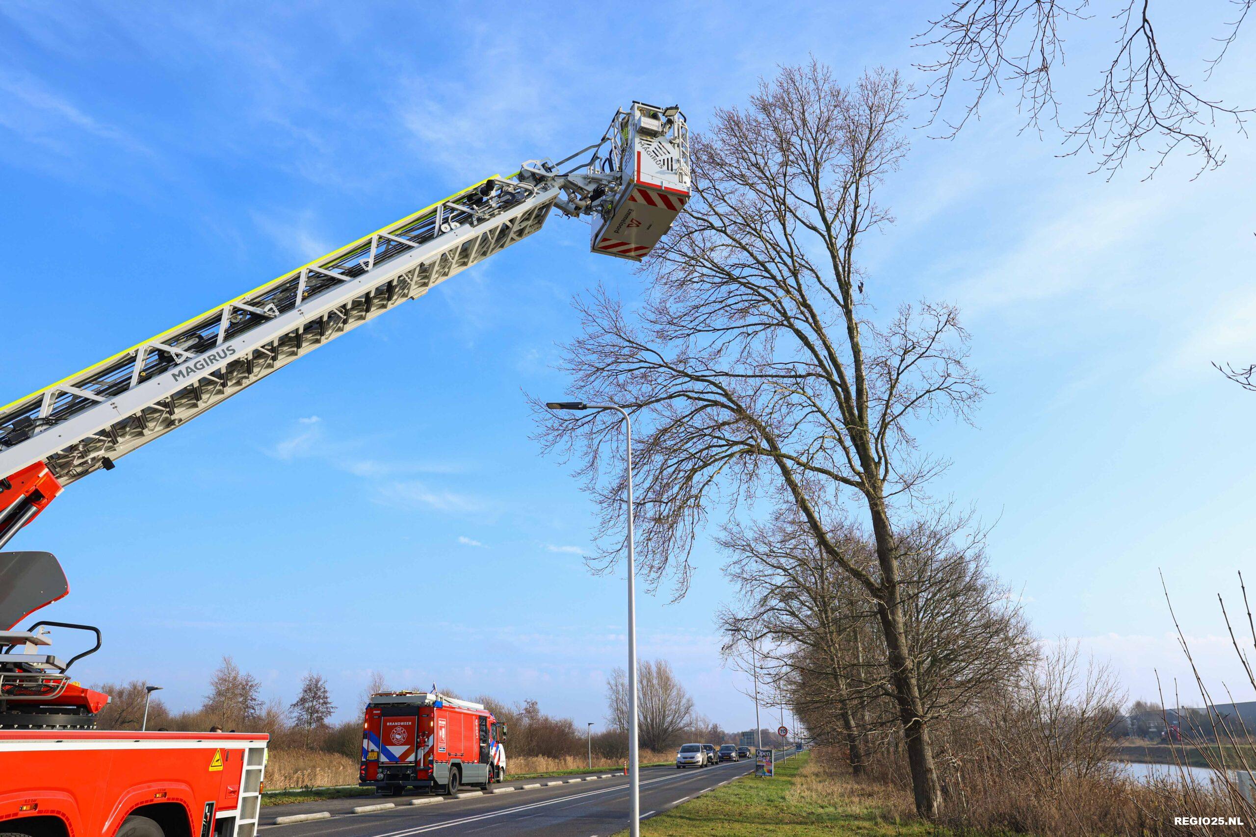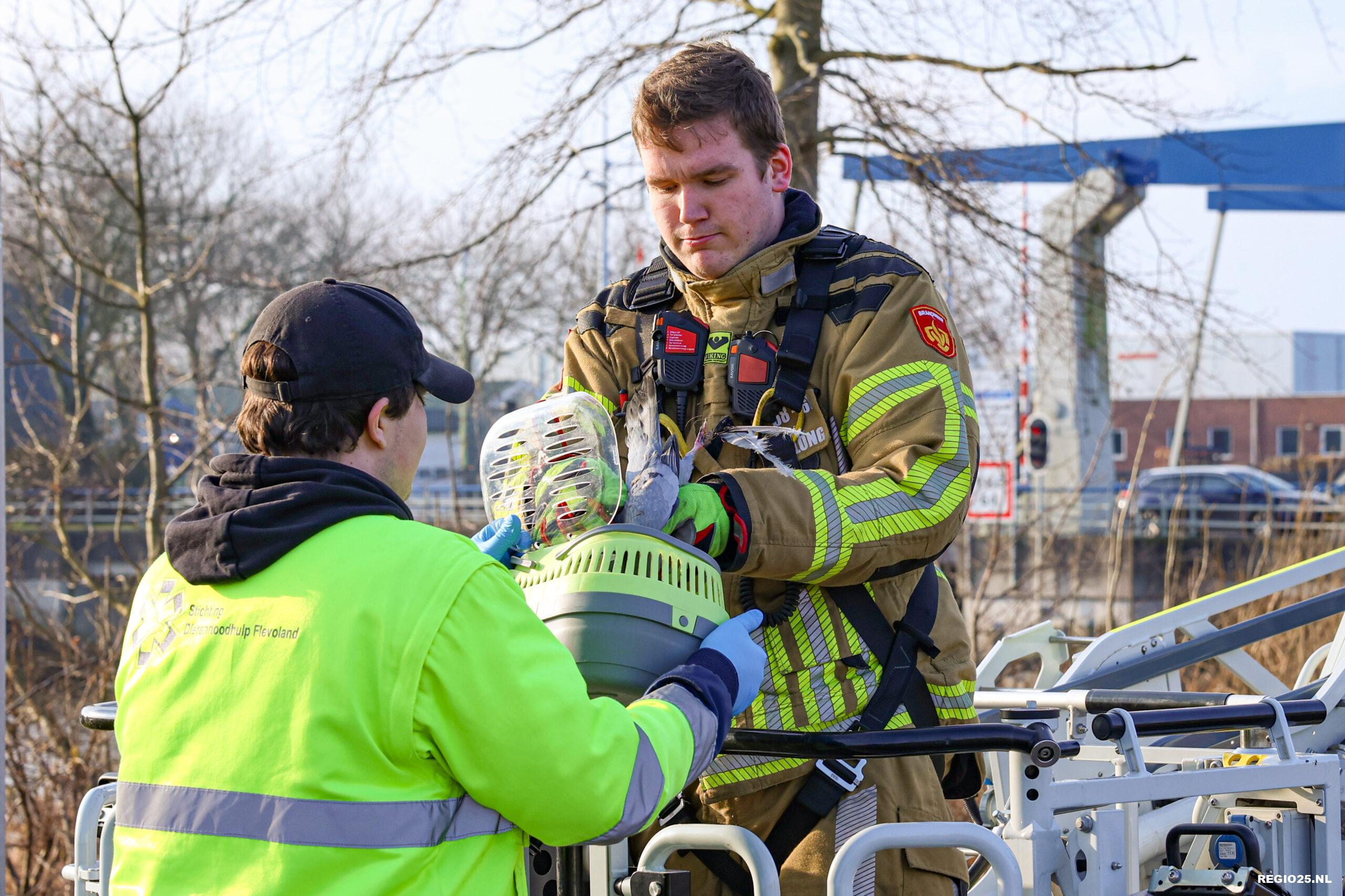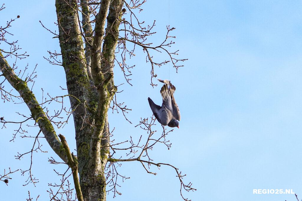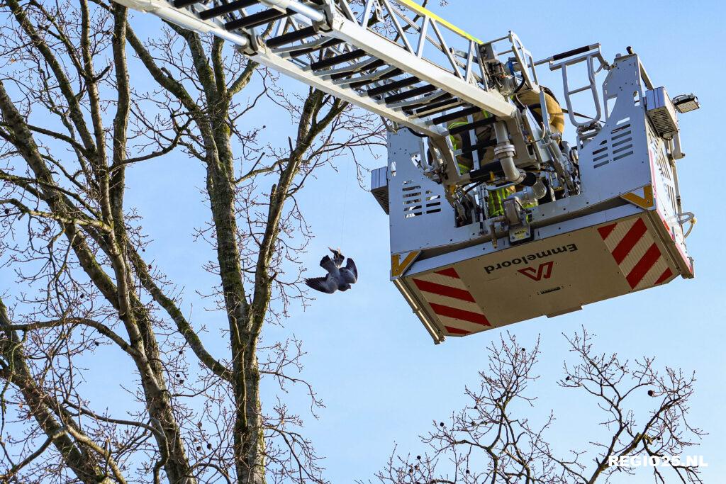 De brandweer heeft maandag rond 12:00 uur een duif in nood gered bij de Arie de Witbrug op Urk. De vogel hing op zo’n 10 meter hoogte in een boom ondersteboven vast aan een visdraad.