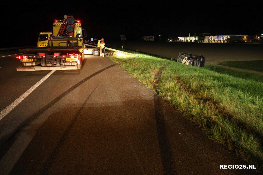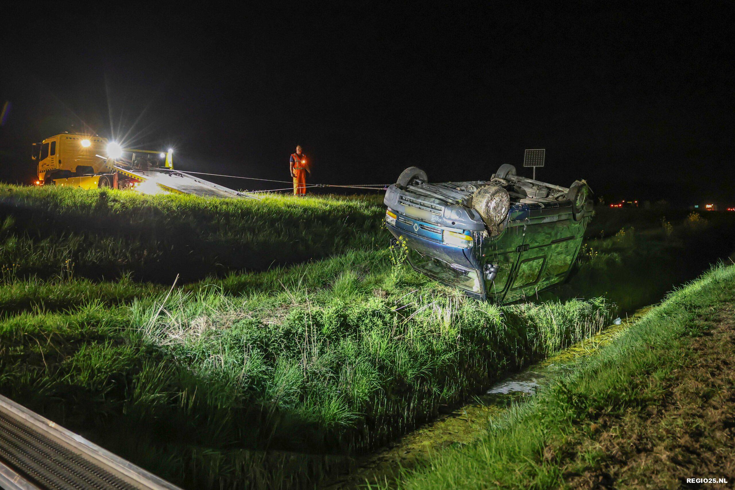 Op de A6 bij Emmeloord is vrijdagavond een camperbusje over de kop geslagen en in een sloot tot stilstand gekomen.