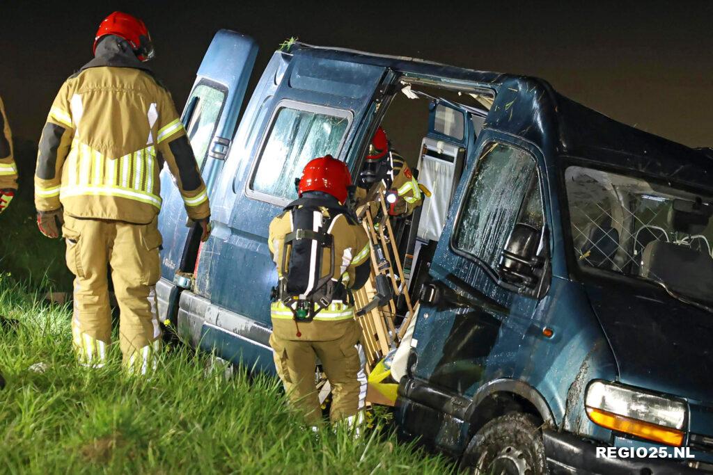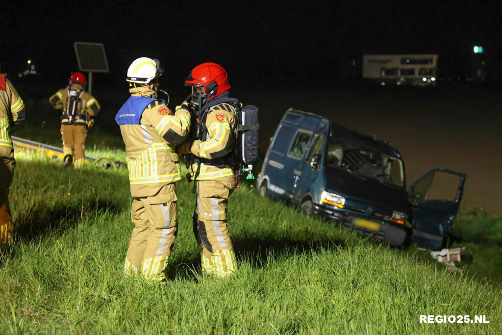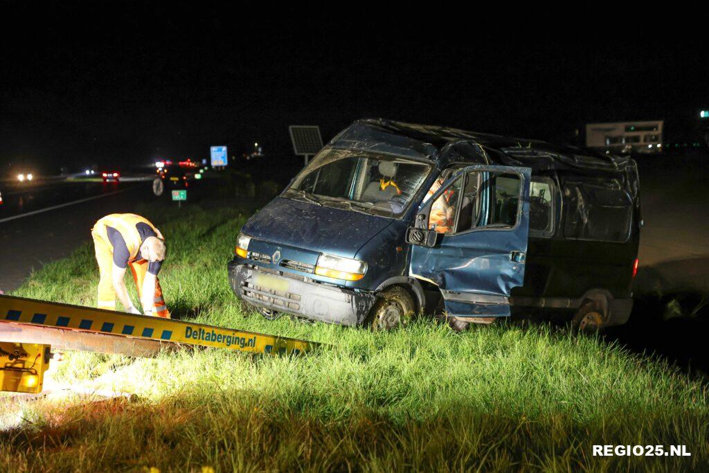 Het éénzijdige ongeluk gebeurde rond 22:30 uur op de A6 ter hoogte van industrieterrein De Munt. Een tot camper omgebouwd busje raakte door nog onbekende oorzaak in de slip, sloeg zeker twee keer over de kop en kwam tot stilstand in een sloot naast de snelweg.