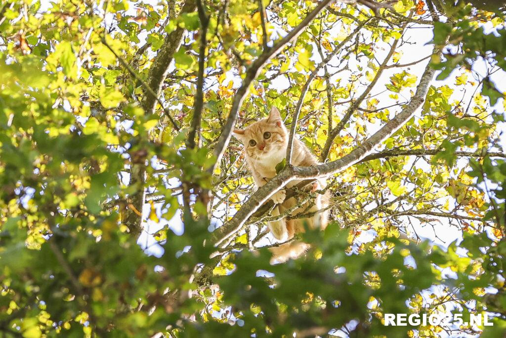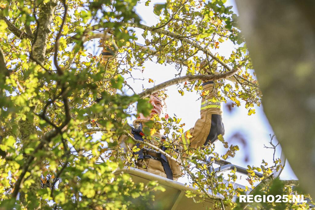 Het ging niet geheel volgens plan van de brandweer, maar er kwam voor het jonge huisdier wel een einde aan het boomavontuur.