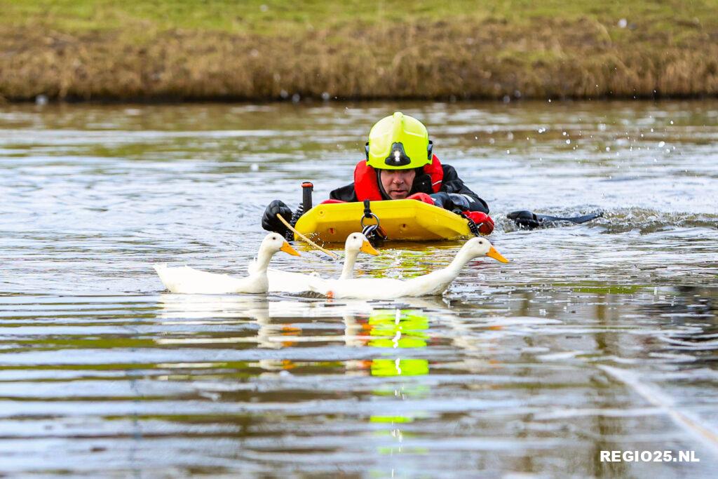 Omdat het nog onduidelijk was of de eend gewond was, probeerde de brandweer het dier te vangen. De eend liet dat niet gebeuren en voegde zich bij zijn twee witte soortgenoten. Na wat heen en weer zwemmen werd de reddingsactie beëindigd.