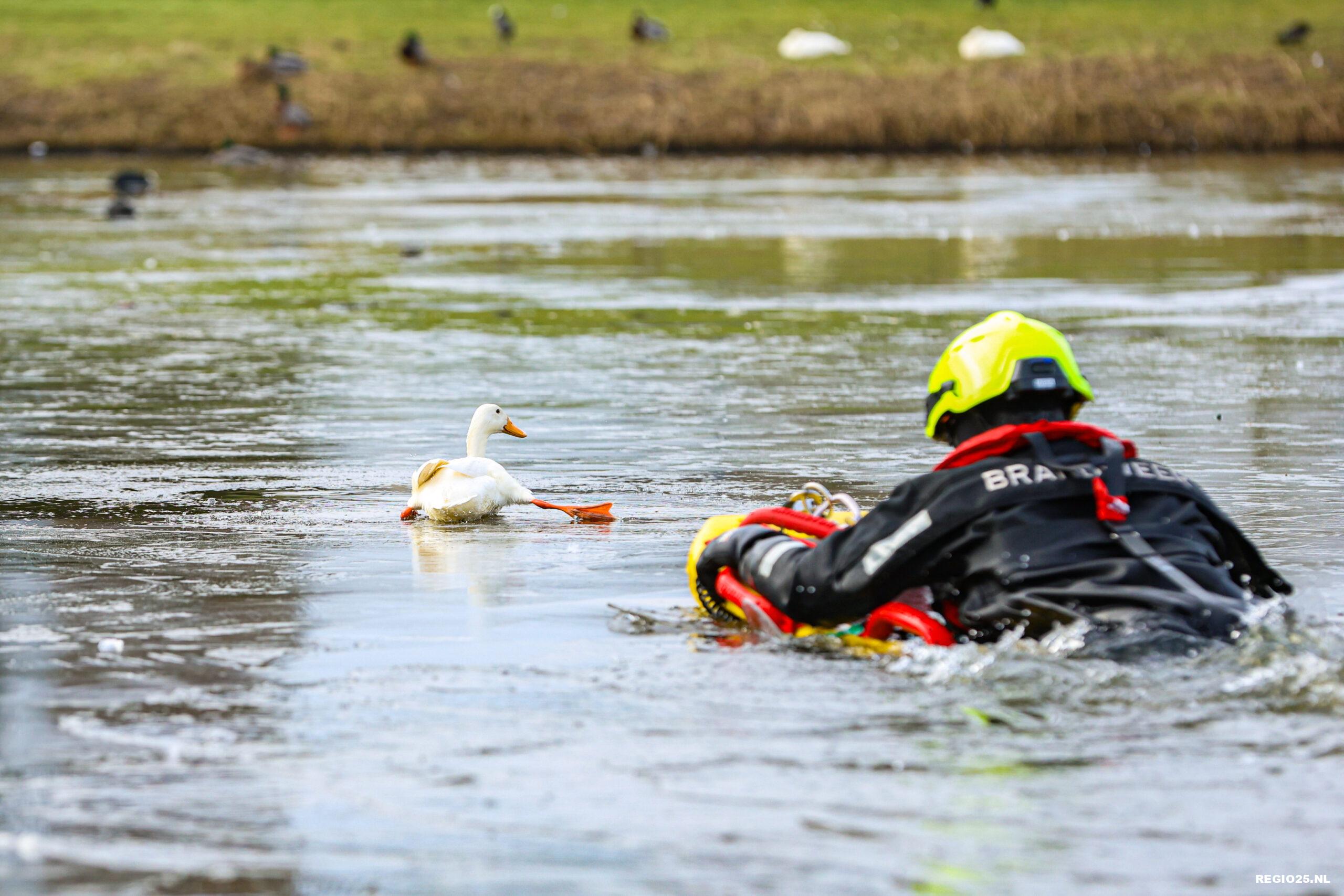De dierenambulance kwam eerst ter plaatse, maar kon weinig betekenen. De hulp van de brandweer werd ingeroepen. Die kwam met een duikteam in actie om de eend te redden, maar toen de duiker het ijs brak en naar de eend toe zwom, ging Roelie ervandoor.