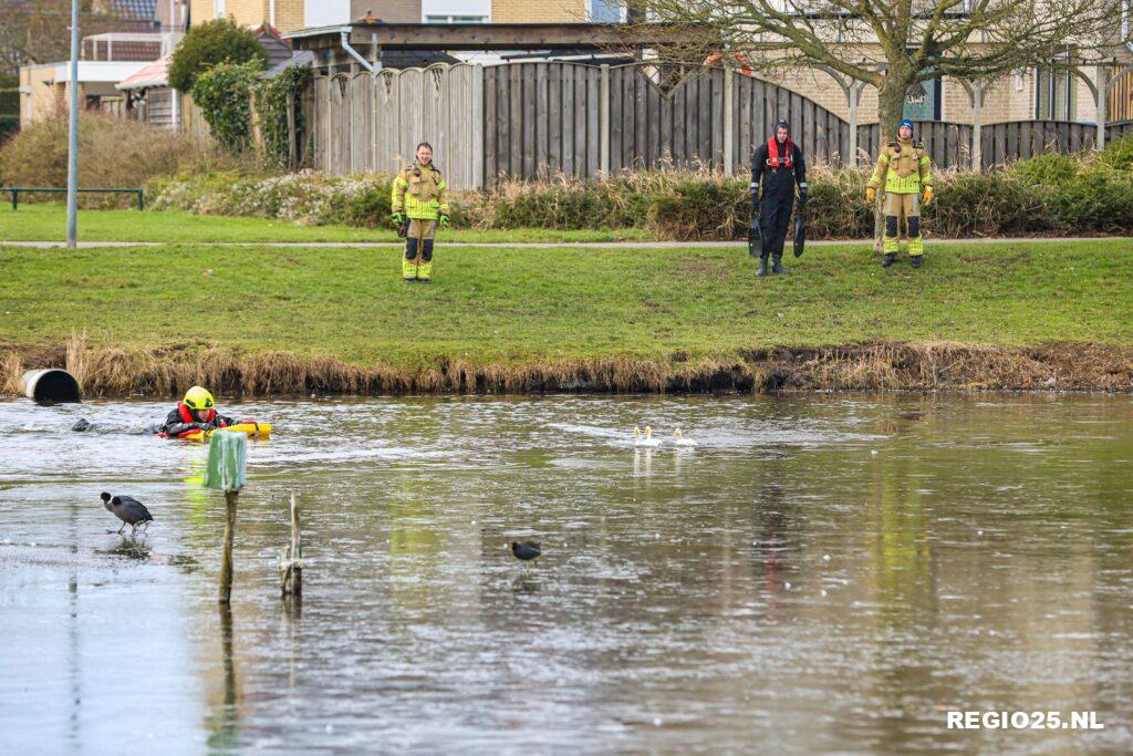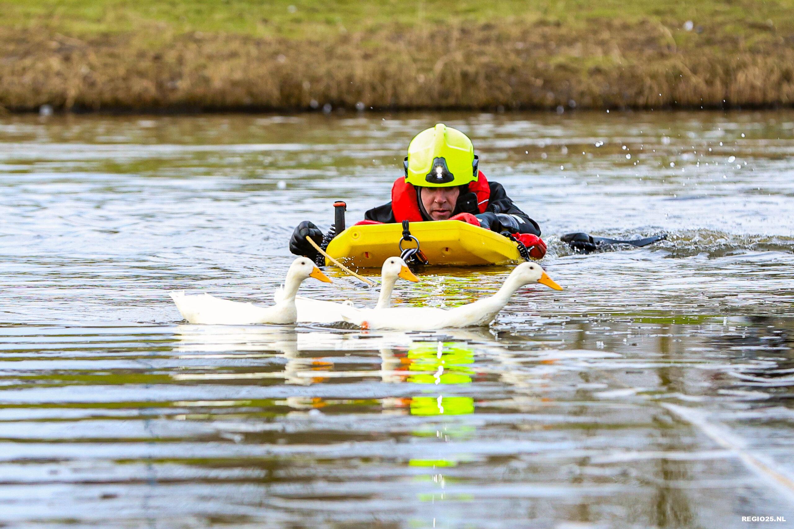Omdat het nog onduidelijk was of de eend gewond was, probeerde de brandweer het dier te vangen. De eend liet dat niet gebeuren en voegde zich bij zijn twee witte soortgenoten. Na wat heen en weer zwemmen werd de reddingsactie beëindigd.