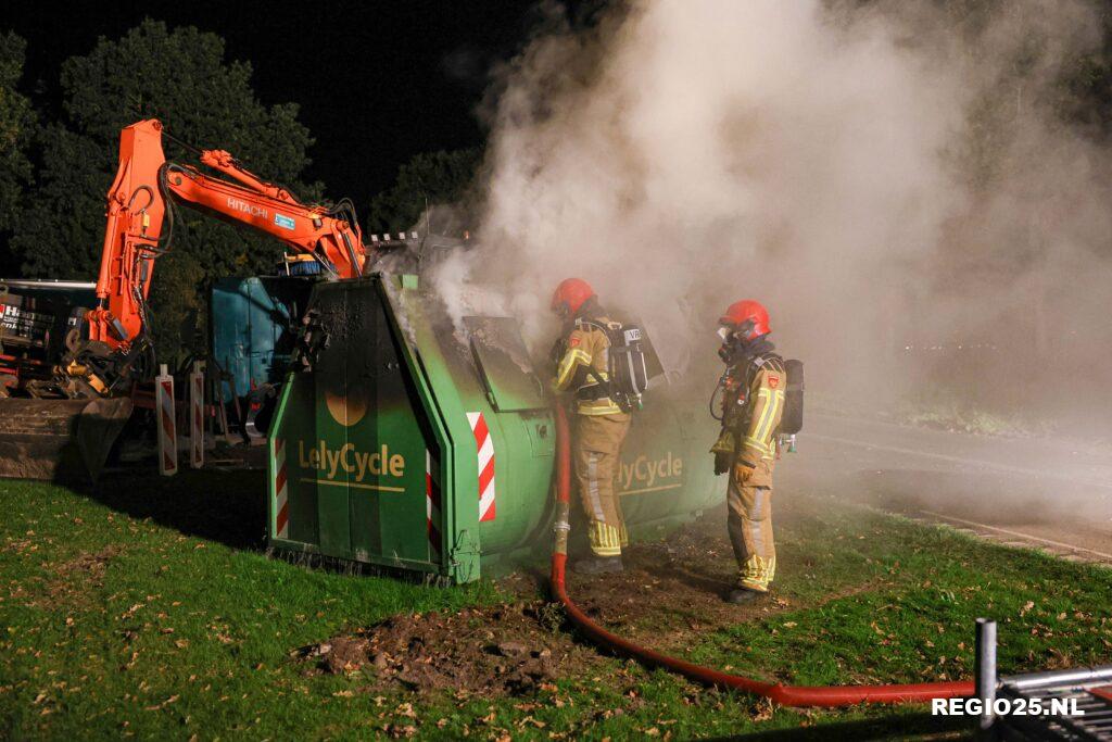 De vlammen sloegen uit een grote container vol met afvalhout. De brand werd even na 22:00 uur door voorbijgangers ontdekt ter hoogte van de rotonde met de Pilotenweg. Vanwege werkzaamheden is de rotonde momenteel afgesloten voor het verkeer.