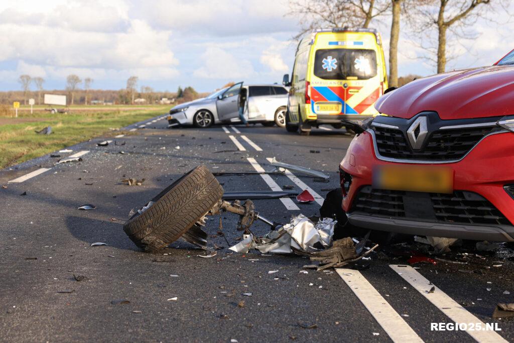 De schade aan de auto’s was flink. De weg lag vol brokstukken. Bij één van de auto’s was een voorwiel afgebroken.