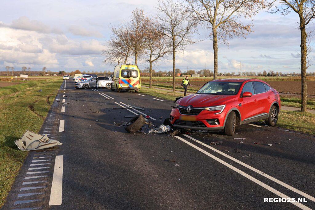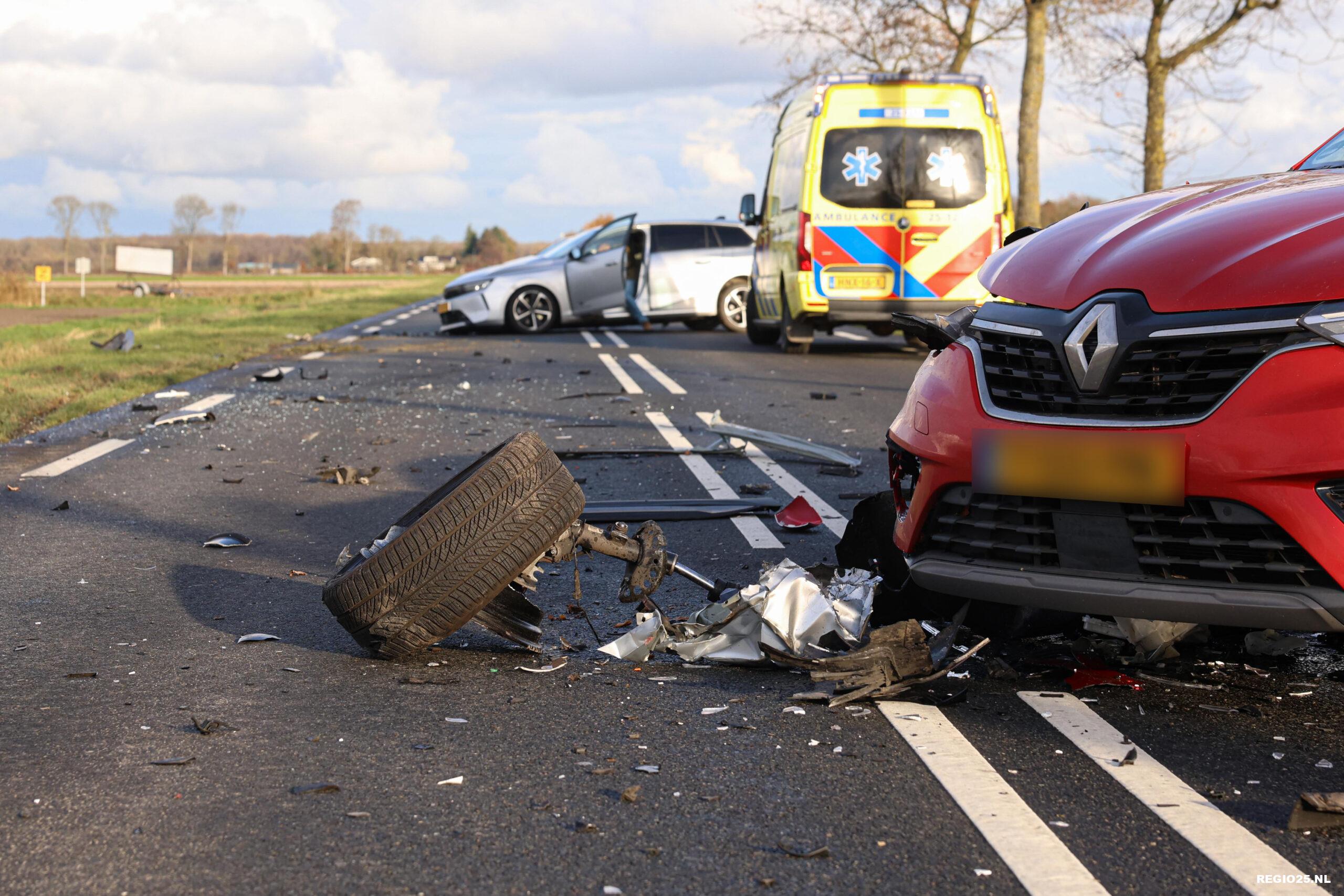 De schade aan de auto’s was flink. De weg lag vol brokstukken. Bij één van de auto’s was een voorwiel afgebroken.