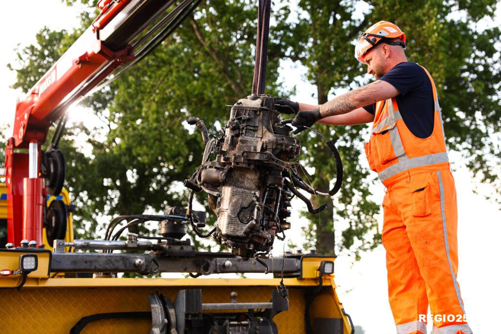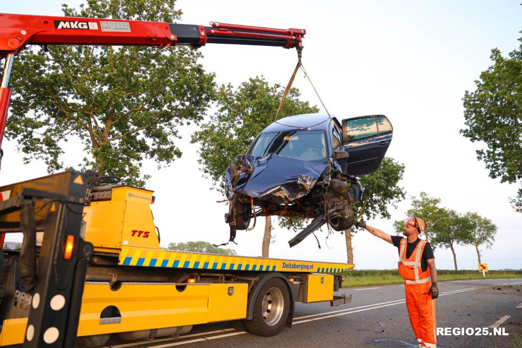 De klap was zo hard dat het motorblok uit de auto werd geslingerd en in een sloot terecht kwam. Ook de weg lag vol met auto-onderdelen en een lang slipspoor schetste de situatie.