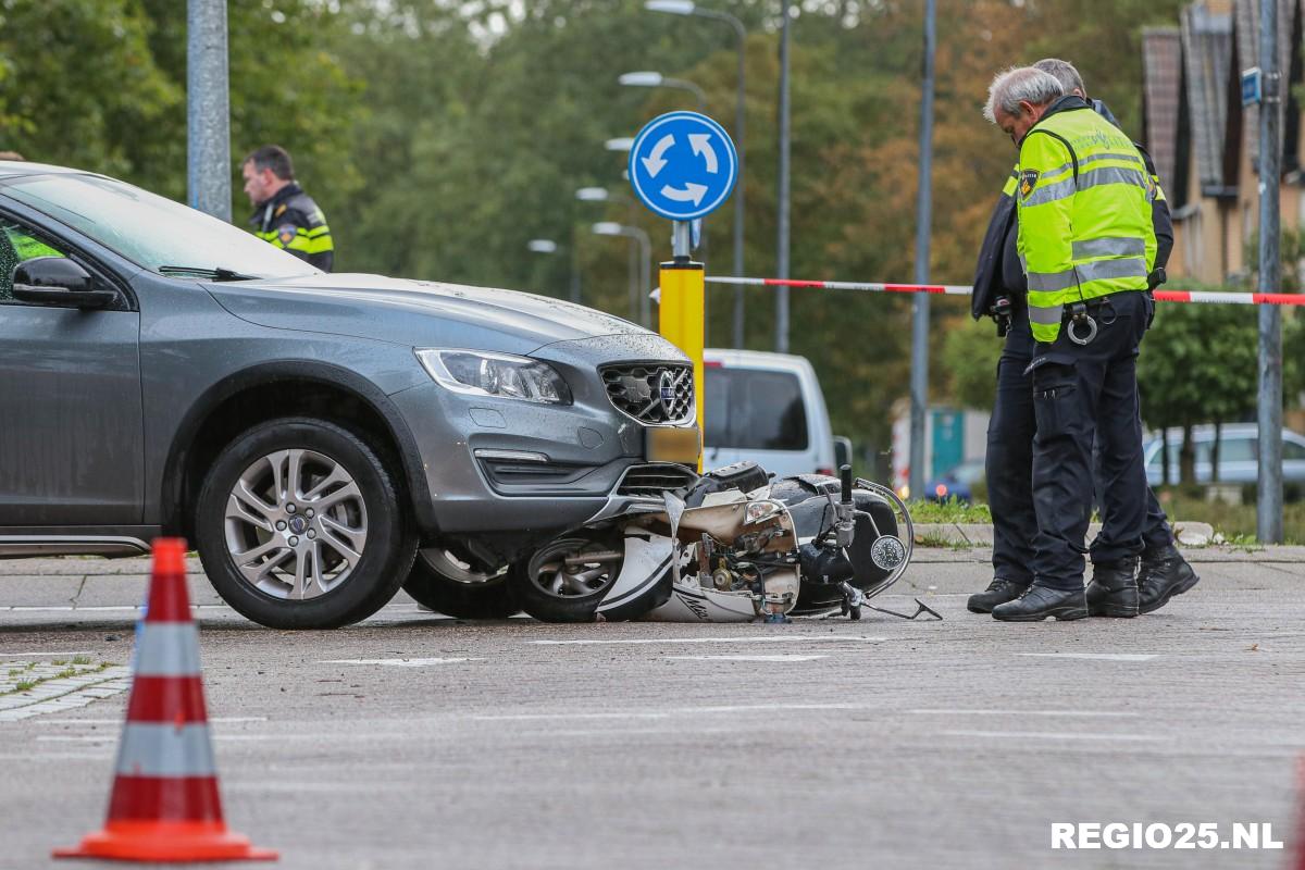 Een auto en een scooter kwamen door nog onbekende oorzaak met elkaar in botsing. De tweewieler kwam hierna klem te zitten onder de bumper van de auto.
