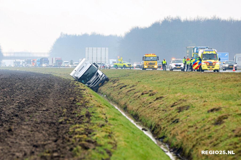 Een vrachtwagen is donderdag rond 12:45 uur een sloot ingereden naast de A6 tussen Emmeloord en Bant.