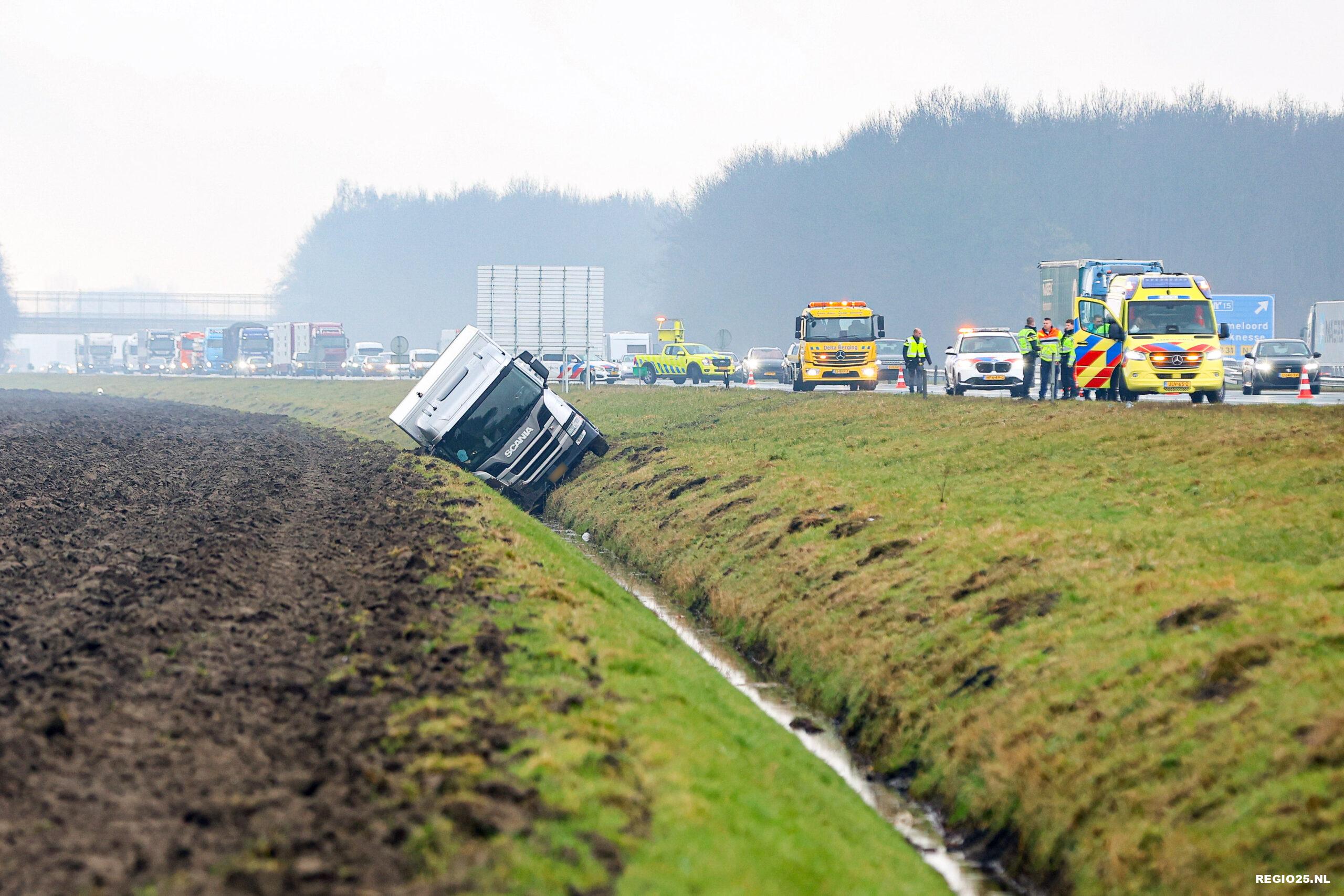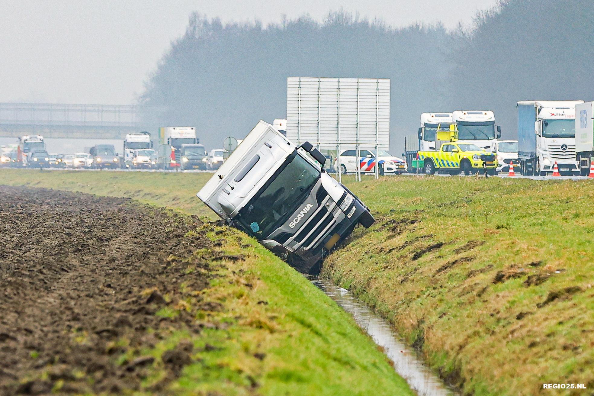 Een vrachtwagen is donderdag rond 12:45 uur een sloot ingereden naast de A6 tussen Emmeloord en Bant.