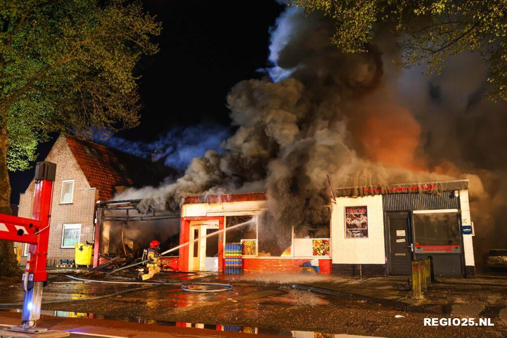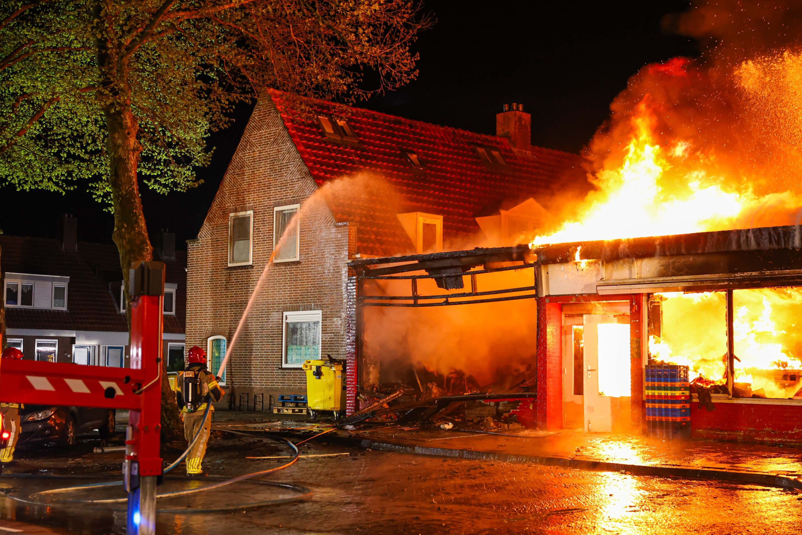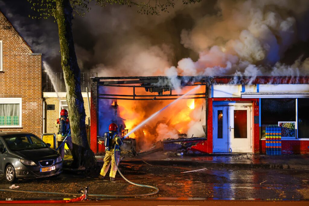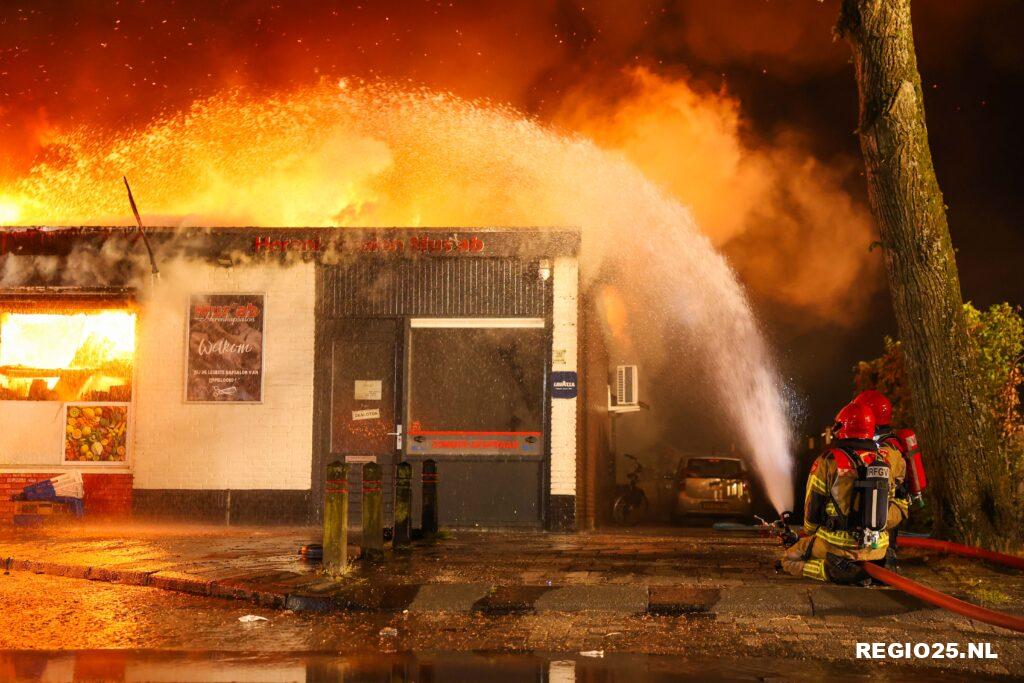 De brand werd omstreeks 00:30 uur gemeld. Bij aankomst van de hulpdiensten sloegen de vlammen metershoog uit de eetgelegenheid. De brand lijkt daar te zijn begonnen en breidde zich al snel uit naar de supermarkt en kapsalon.