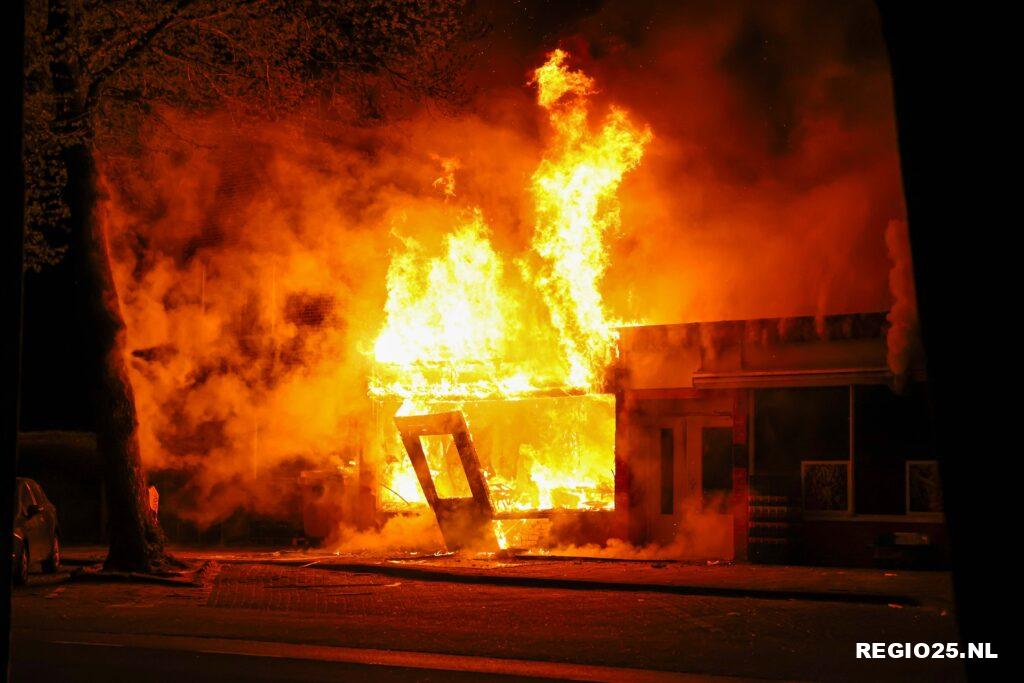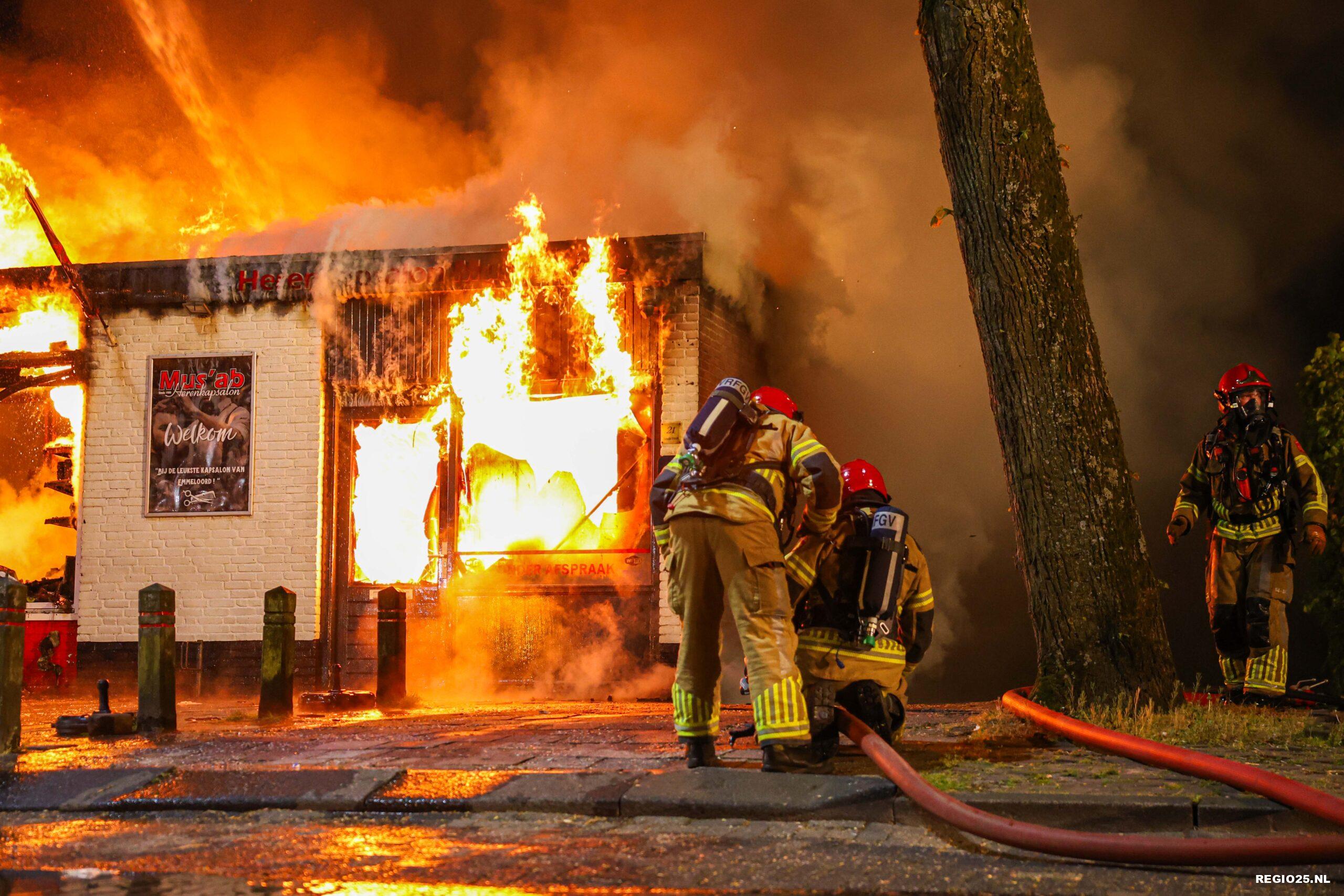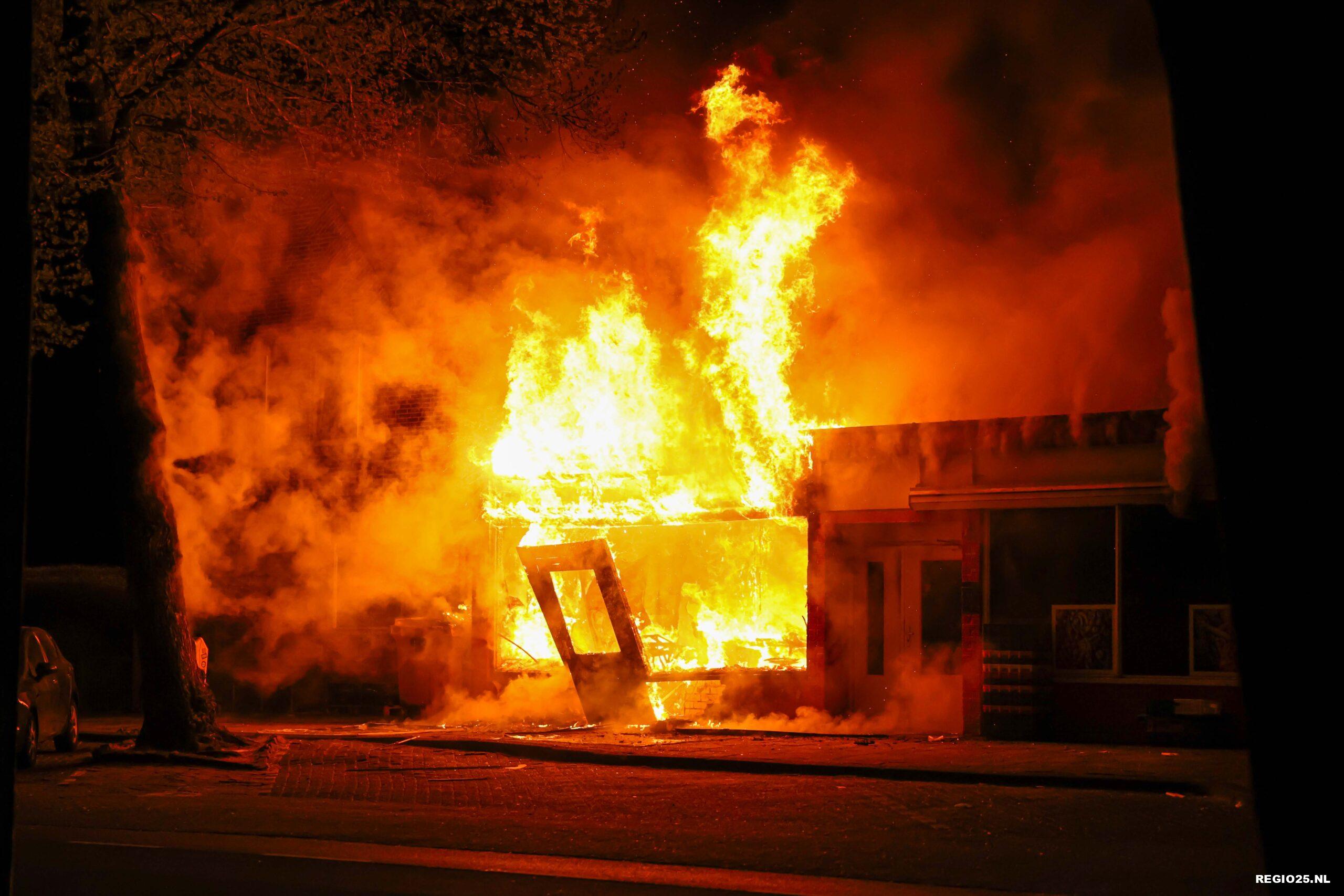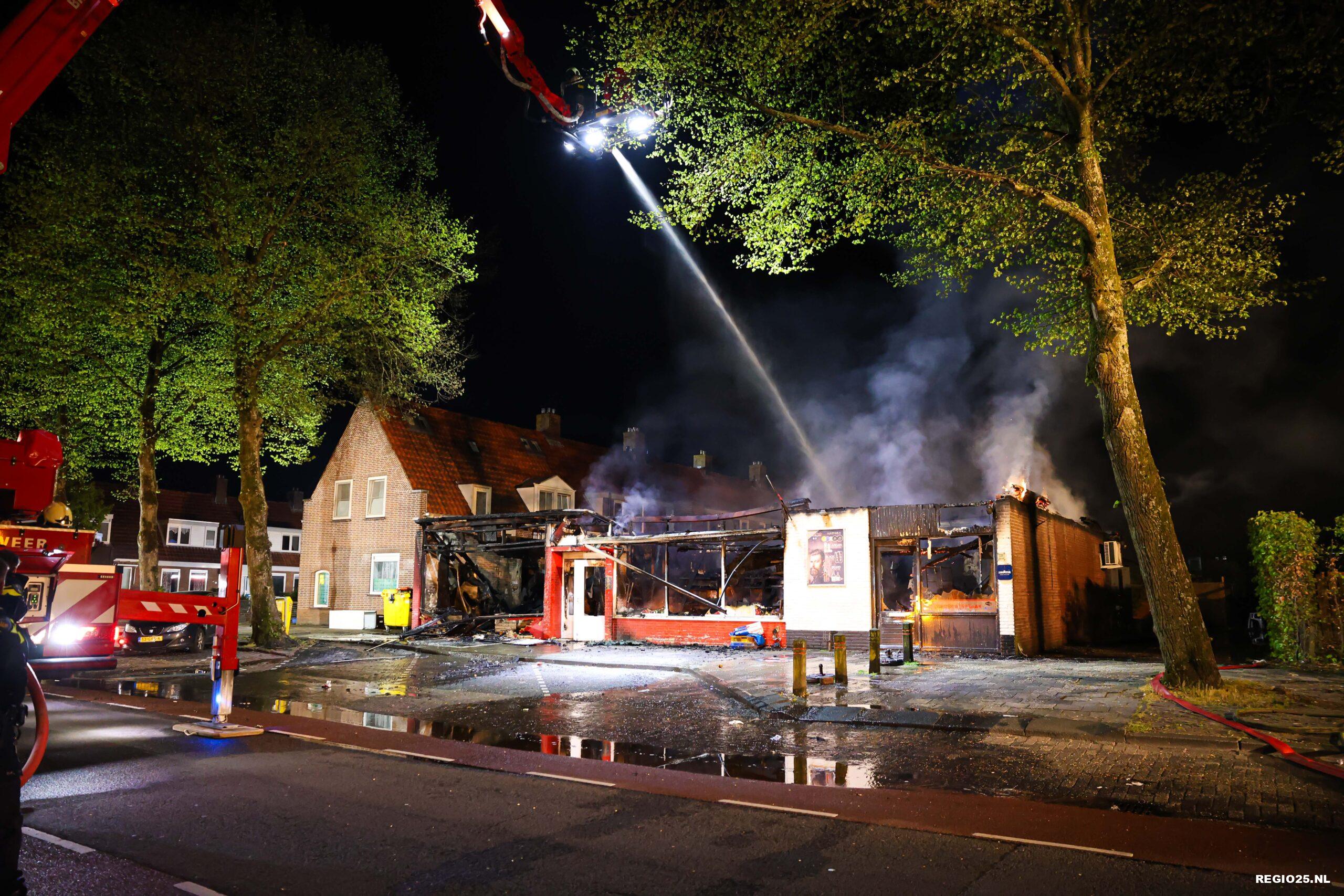 De brand werd omstreeks 00:30 uur gemeld. Bij aankomst van de hulpdiensten sloegen de vlammen metershoog uit de eetgelegenheid. De brand lijkt daar te zijn begonnen en breidde zich al snel uit naar de supermarkt en kapsalon.