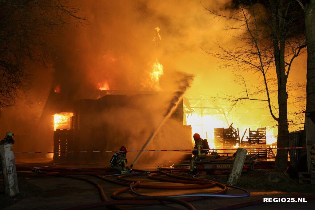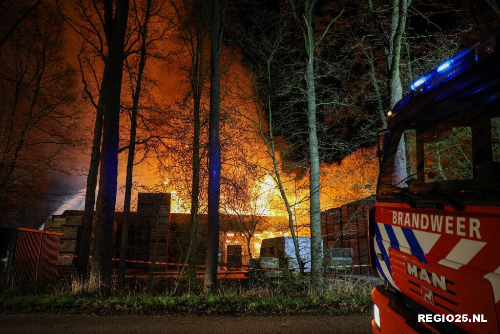 De brand werd rond 23:15 uur ontdekt in één van de schuren op het erf van het bedrijf. Bij aankomst van de brandweer ging het al om een uitslaande brand. Het vuur sloeg over naar een tweede schuur. Beide schuren waren gevuld met gedroogd openhaardhout. Ook een stapel kuubskisten naast de schuren vatte vlam.